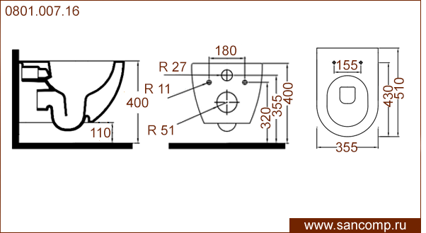 0801.007.16 Унитаз подвесной с горизонтальным выпуском