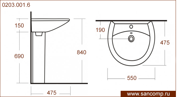 0203.001.6 Раковина с пьедесталом полукруглая ГЛУБОКАЯ
