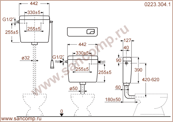 0223.304.1 Бачок настенный универсальный из пластика с двумя вариантами управления смывом | ||
