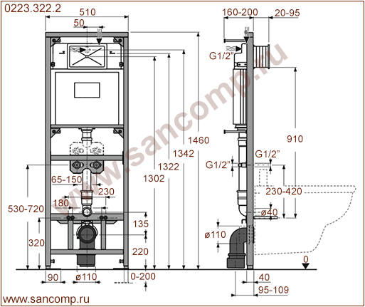 0223.322.2 Инсталляция для подвесного видуара с креплением для настенного смесителя | ||